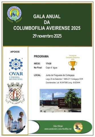 A Associação Columbófila do Distrito de Aveiro, realizou no passado dia 29/11/2025 a sua Gala Anual da Columbofilia Aveirense no Centro Cívico de Cortegaça. Veja aqui: