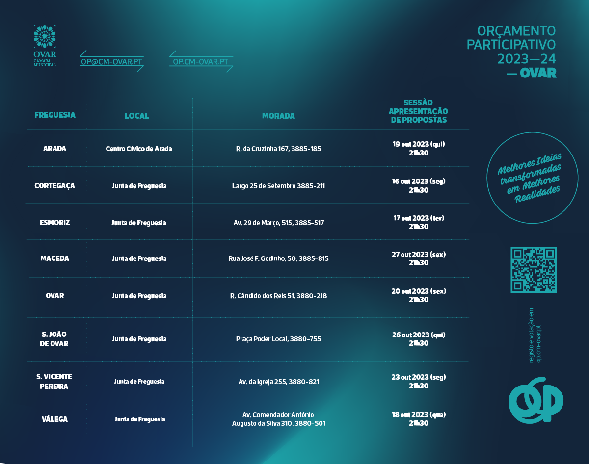 Todos os detalhes sobre o Orçamento Participativo 2024/2025, incluindo as propostas a votação e o regulamento, estão disponíveis na página oficial em op.cm-ovar.pt.